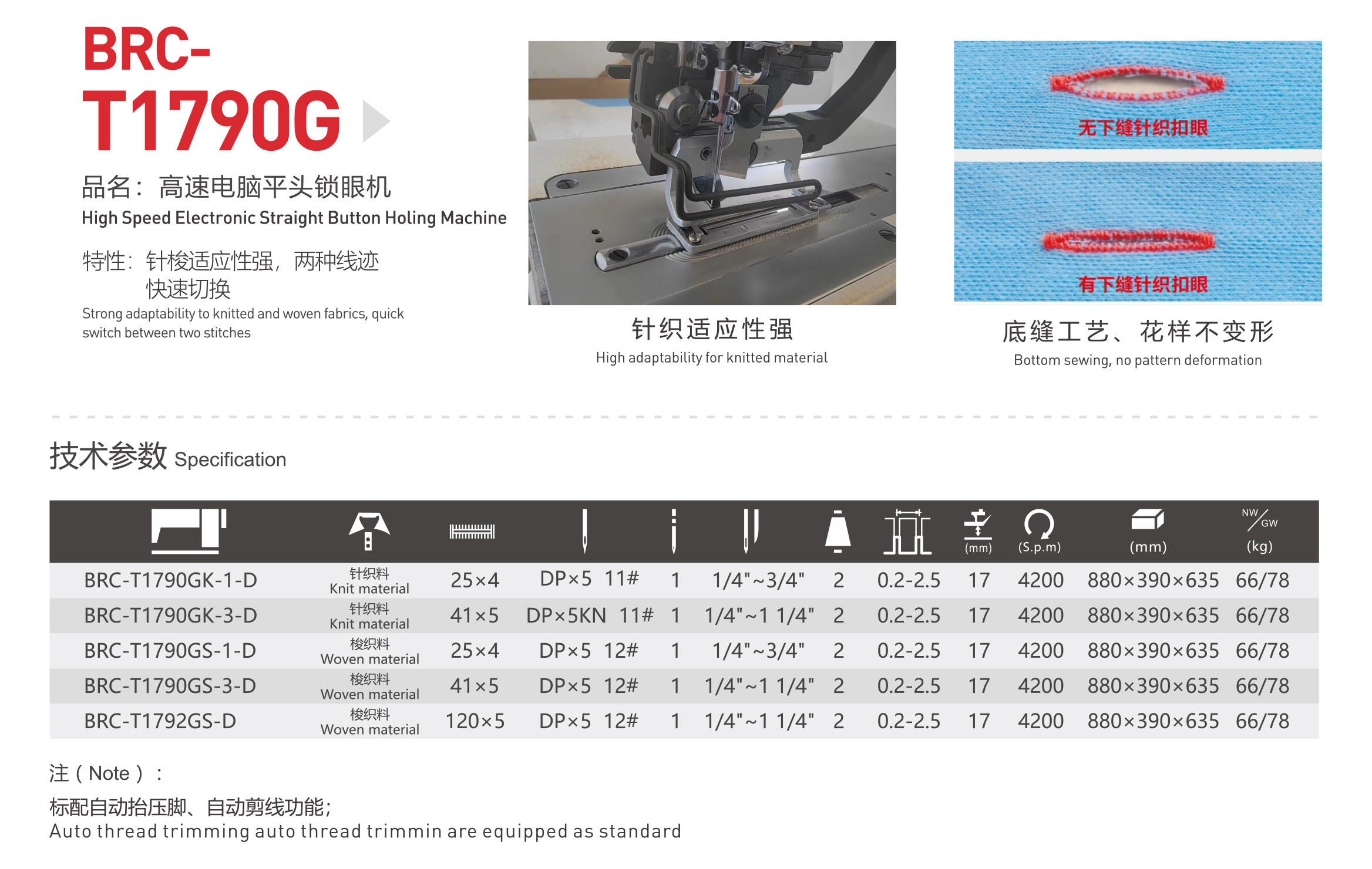 BRUCE/BRC-T1790G ELECTRONIC LOCKSTITCH BUTTONHOLING MACHINE