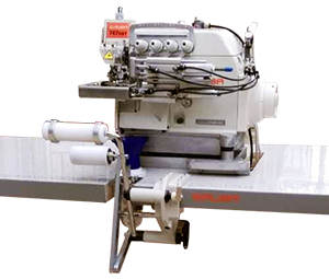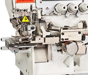In blindstitch hemming operation, ESK prevents stitch skipping or ply-shifting at the cross seam sections. The full set includes direct-drive servo motor, VT side suction trimmer, TUA suction set, auto foot lifter.