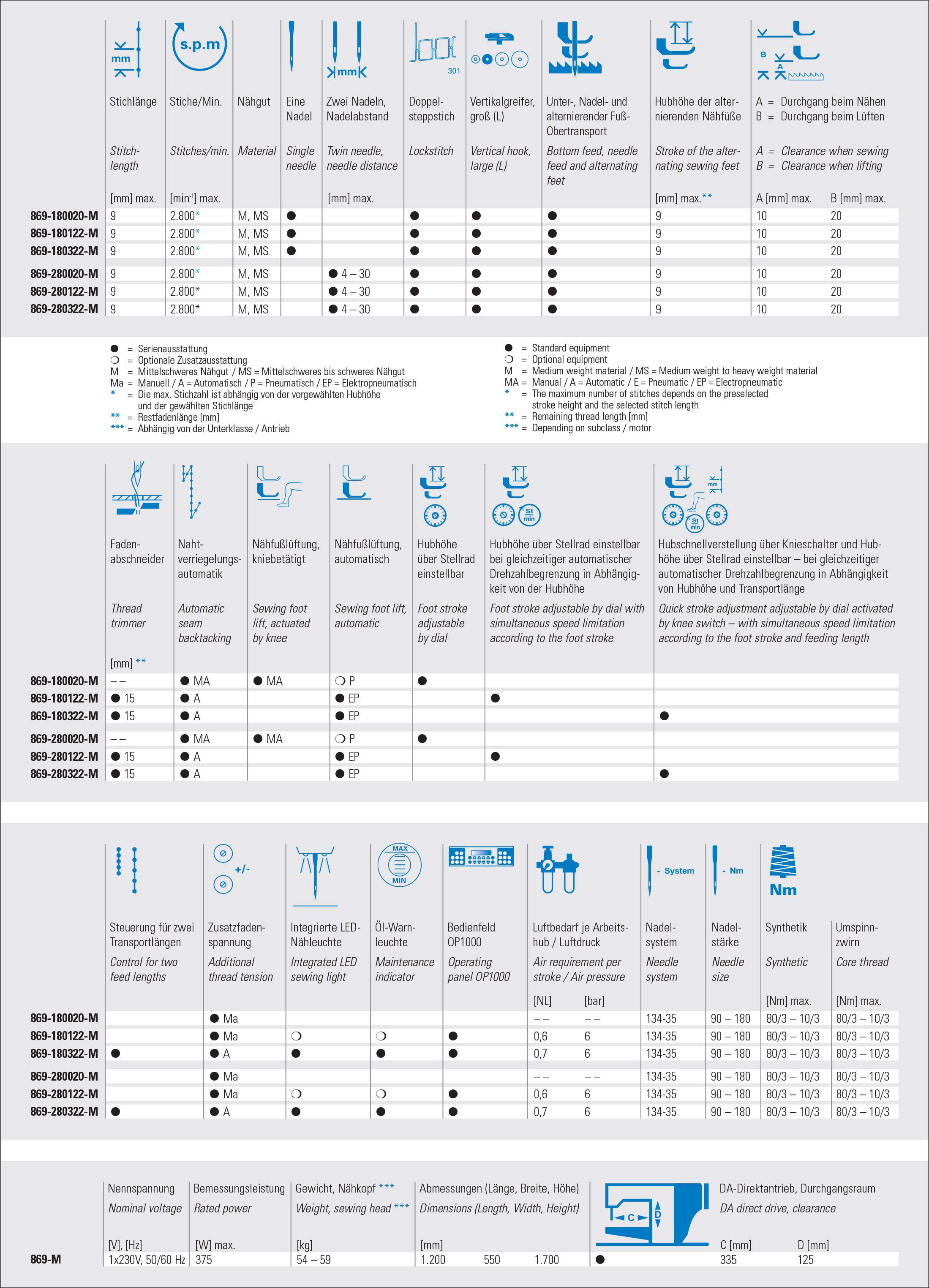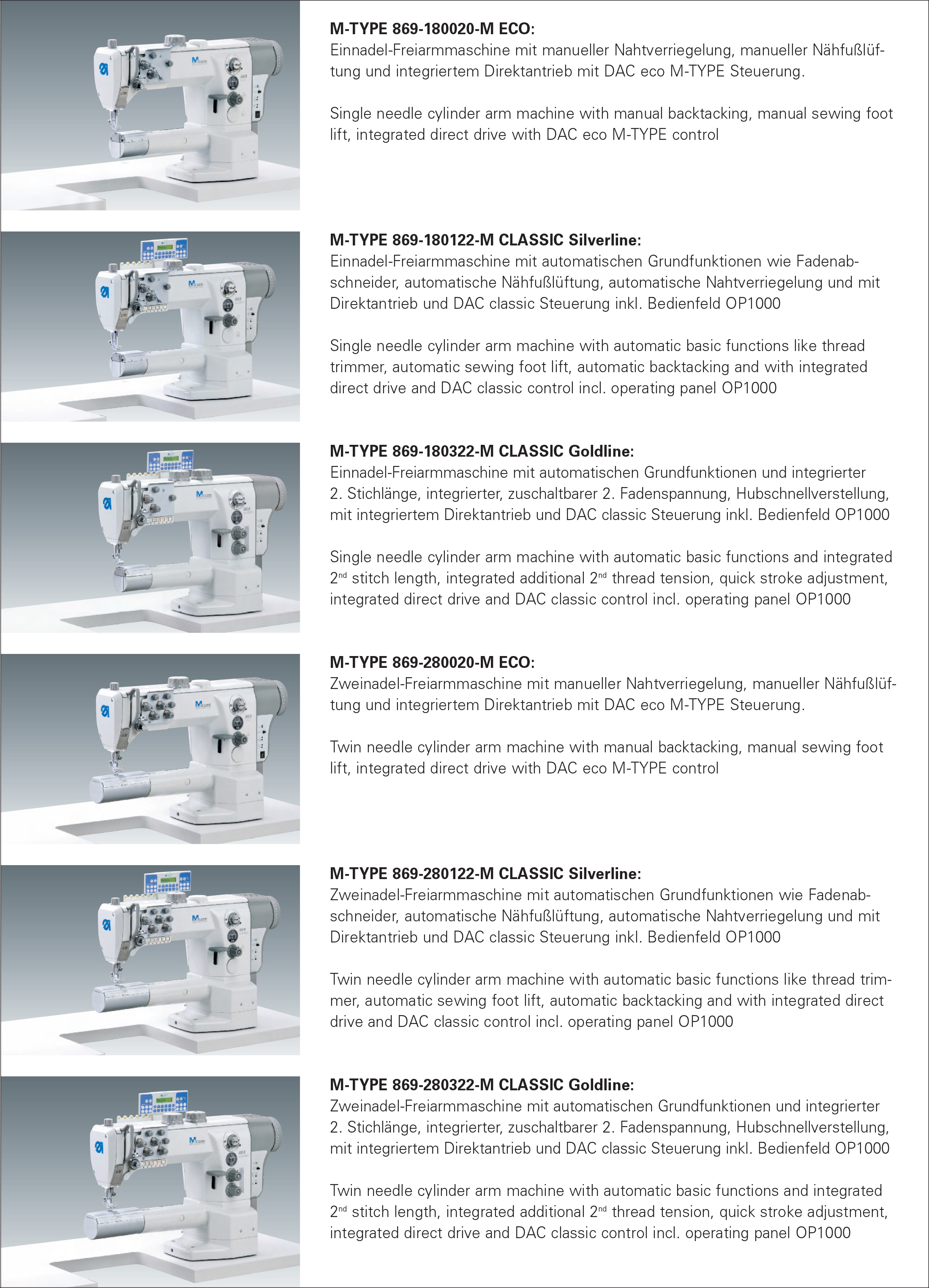 • 869-M CLASSIC Goldline – with automatic basic functions and further additional functions for higher productivity and increased sewing comfort
