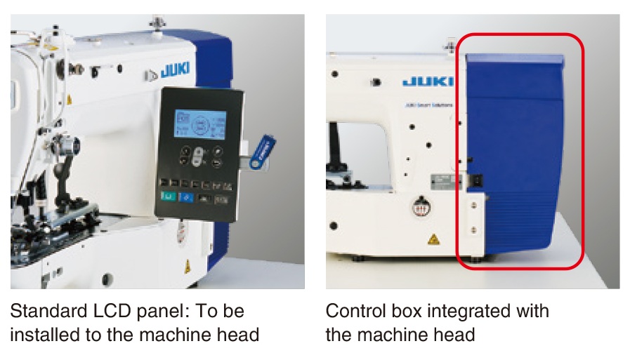 - The control box integrated with the machine head, originally designed by JUKI, is adopted. The number of standard patterns is 50. As many as 999 patterns (500,000 stitches) can be stored in memory. The new upright type operation panel is installed on the side face of the machine head to allow the operator to operate the machine without averting his/her eyes, during sewing, from the bartack being sewn. In addition, the table surface can be used widely. The operation panel can also be installed on the table as before.