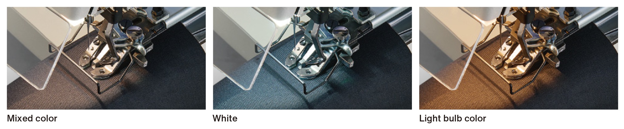 - The LED hand light is now provided with color matching function using two colors (white/light bulb color) in addition to the conventional dimming function. Illumination is adjustable in five levels and dimming is in 10 levels to help reduce the eye fatigue of the operator who is engaged in sewing operation for extended hours.