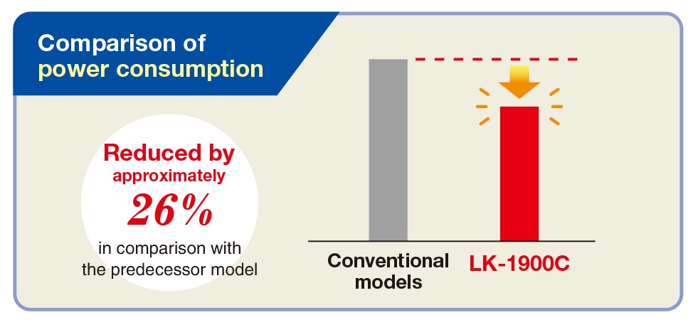 - Aiming at the creation of environment-conscious products, an encoder is mounted on the stepping motor. Thanks to the JUKI's unique control technology, power consumption of this machine is reduced by approximately 26% in comparison with the predeces-sor model.