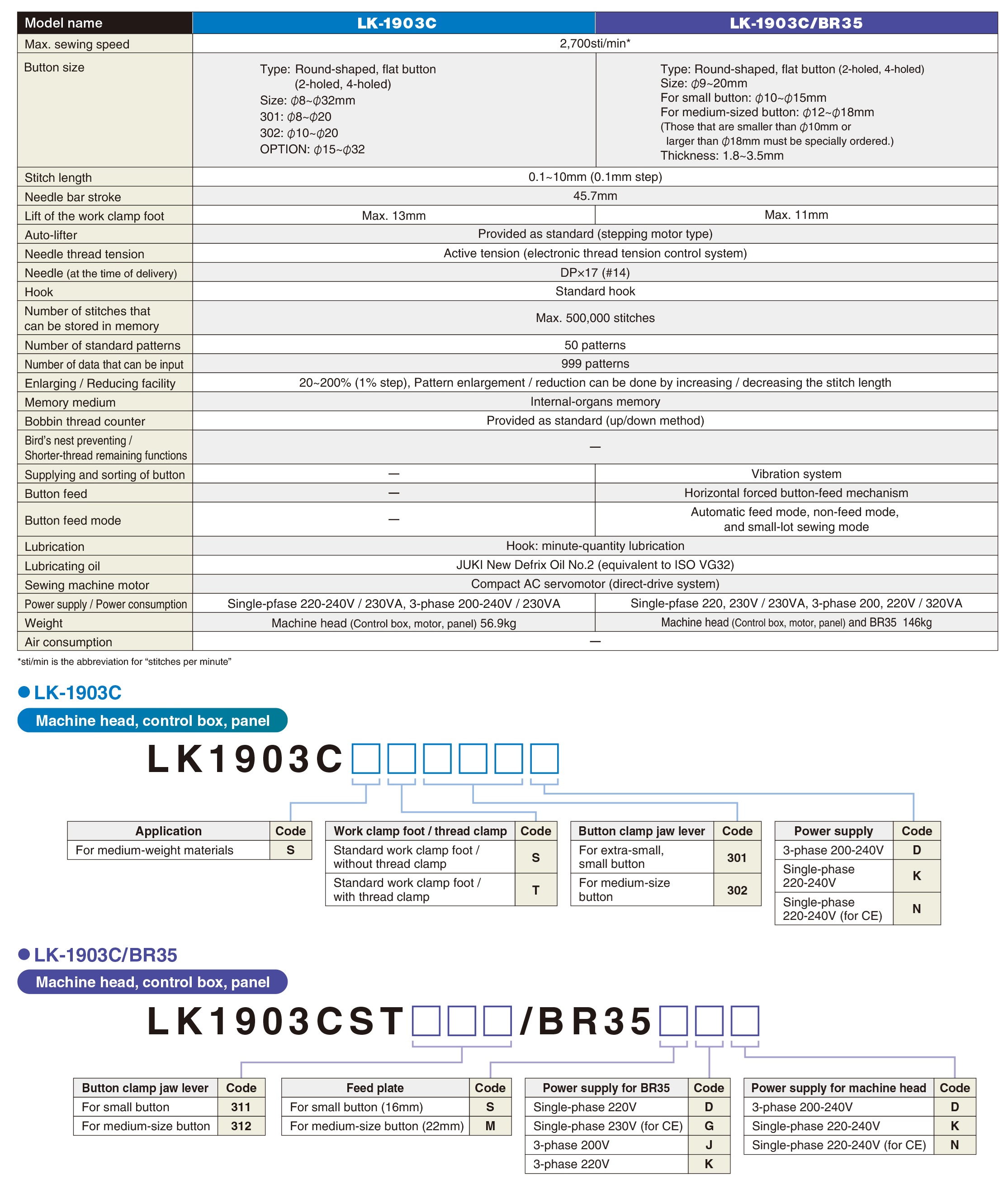 - The LK-1903C achieves sewing speed of 2,700sti/min. The machine's starting, stopping, thread-trimming and automatic presser lifting speeds have been increased to significantly shorten total cycle time. This is a lockstitch button sewing machine that supports a variety of sewing patterns and cycle sewing.